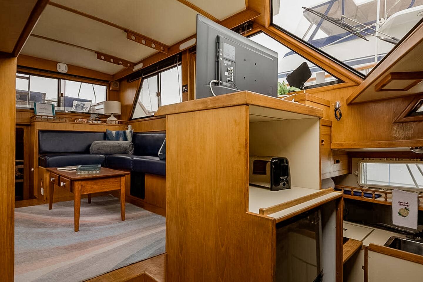 Step aboard the Carpe Diem II and be welcomed by her aft deck, inviting you to sit and relax, and engage in great conversation. Move to the fly-bridge for a 360° view of the marina and harbor. Heading inside, the main salon offers comfortable seating for 6. It's a great spot to cozy up with a book after a fun day in the city. A Bluetooth speaker, Smart-TV, and ample plugs for charging your devices add to the livability of the boat. Step down to the galley and dinette, equipped with everything you need to make a meal onboard: a two-burner induction cooktop, convection microwave/oven, toaster, small fridge, and plenty of glasses, crockery, cutlery, and pots and pans. The cooking basics such as salt, pepper, oil, sugar, tea, coffee, and a welcome bowl of snacks are also provided. The dinette table comfortably sits 4 and lowers to turn into an extra twin/full bed. Enter the private forward and aft staterooms made up with luxury linens, blankets, pillows, and duvets. Grab a fluffy towel before entering one of two bathrooms. Equipped with quiet and reliable heads (toilets), hot showers, and shampoo, conditioner, and body wash. Central A/C and heat keep the boat comfortable no matter what the New England weather throws at you. Located in the oldest neighborhood in Boston, Charlestown, the boat is close to many popular Boston destinations: A 5-minute walk to the USS Constitution A 10-minute walk to the Bunker Hill Monument A 5-minute walk to the Freedom Trail A 15-minute walk to the North End (Ferry service available as well!) A 20-minute walk to Downtown and Faneuil Hall A 10-minute walk to the TD Garden A 20-minute Uber/Taxi ride to Fenway Park A 15-minute Water Taxi ride to Seaport Logan Airport is just a 10-15 minute Uber/Lyft/Taxi ride away, and a 20-30 minute Water Taxi ride away.