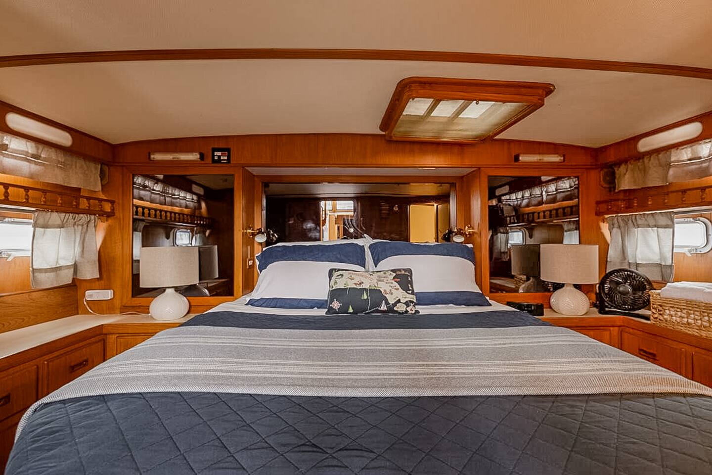 Escape the hustle and bustle of the city and unwind aboard Carpe Diem II, a yacht with 2 comfy queen staterooms for up to 4 adults. Each stateroom has a private bathroom and shower. Unwind on the aft deck with meals and cocktails as the boats sail by on the harbor, or warm up or cool off inside with central A/C and heat. Located in Charlestown Navy Yard, steps to Freedom Trail, North End, and Downtown. Book now and enjoy the unique charm of living on the water in this historic neighborhood.
